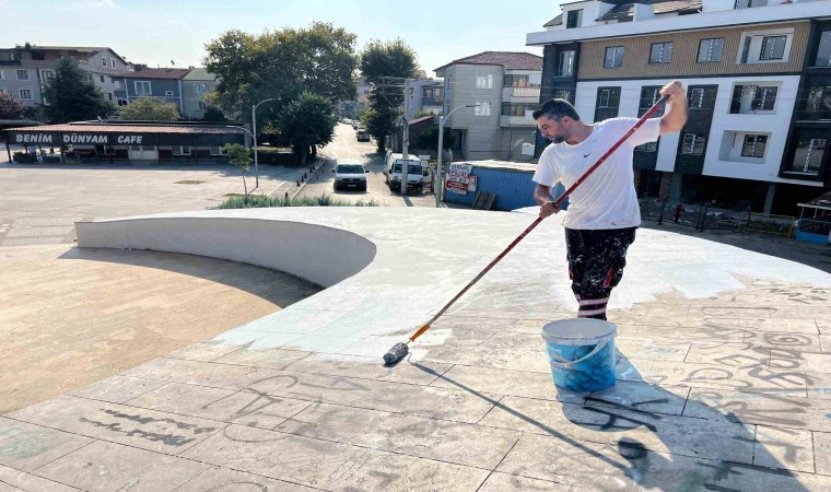 Körfez’de belediye ekipleri görüntü kirliliği oluşturan duvar yazılarını temizleyip, boyuyor.