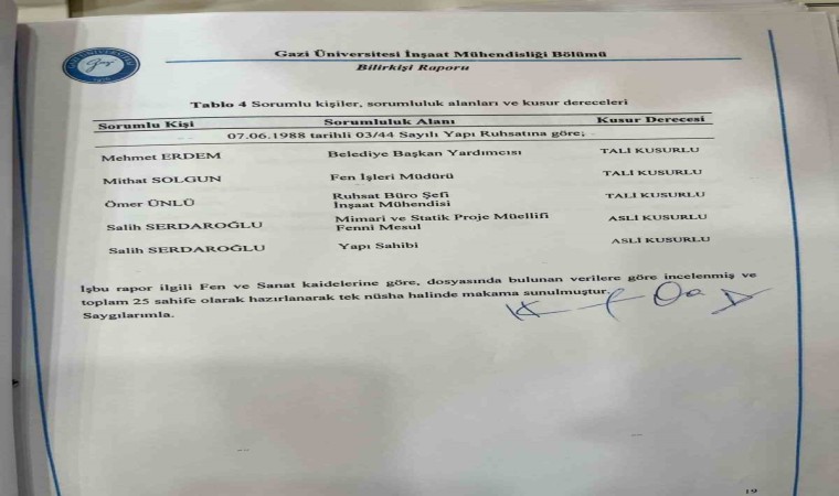 Aynı raporda dönemin yapı sahibi Salih Serdaroğlu ise ‘asli kusurlu’ sayıldı.