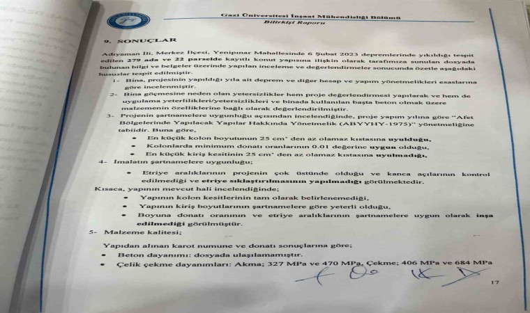 Ayrıca raporda otelin afet bölgelerinde yapılacak yapılar hakkında ki yönetmeliğine uyulmadığı yazıldı. Raporda, ‘En küçük kolon boyutunun 25 santimetreden az olamaz kıstasına uyulduğu, kolonlarda minimum donatı oranlarının 0.01 değerine uygun olduğu, en küçük kiriş kesitinin 25 santimetreden az olamaz kıstasına uyulmadığı, etriye aralıklarının projenin çok üstünde olduğu ve kanca açılarının kontrol edilmediği ve etriye sıklaştırılmasının yapılmadığı görülmektedir’ denildi.
