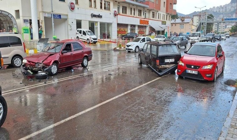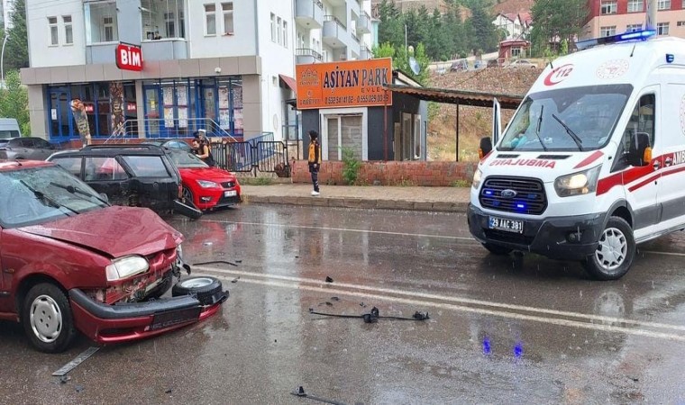 Edinilen bilgiye göre, Yeni Mahalle Kazım Karabekir Caddesi üzerindeki akaryakıt istasyonundan çıkarak Gümüşhane istikametine dönmek isteyen Mustafa Okur yönetimindeki 29 AK 968 plakalı otomobile, Bayburt istikametine ilerleyen Fahri Ölmez yönetimindeki 29 AAN 854 plakalı otomobil çarptı. Yağış nedeniyle kayganlaşan yolda çarpmanın etkisiyle savrulan 29 AK 968 plakalı otomobil, marketin önünde park halinde bulunan 61 FR 130 plakalı araca çarparak durabildi. Kazadan sürücüler yara almadan kurtulurken, kaldırımdan o esnada kimsenin geçmemesi muhtemel bir facianın önüne geçti.