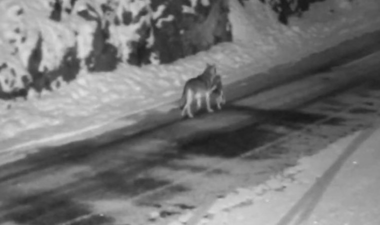 Gümüşhane’nin Kürtün ilçesi Özkürtün Beldesi’nde aç kalan kurtlar Süme Mahallesi’ne indi. Mahalle merkezine inen 2 kurt bölgede bir süre dolaştıktan sonra ormanlık alanda gözden kayboldu. Bir süre sonra tekrar ortaya çıkan kurtlardan bir tanesinin ağzında avladığı köpekle yol üzerinde yürüdüğü anlar ise bir iş yerinin güvenlik kameralarına yansıdı. Parçalanmış sokak köpeğini ağzında taşıyan kurt bir süre sonra karanlıkta gözden kayboldu.