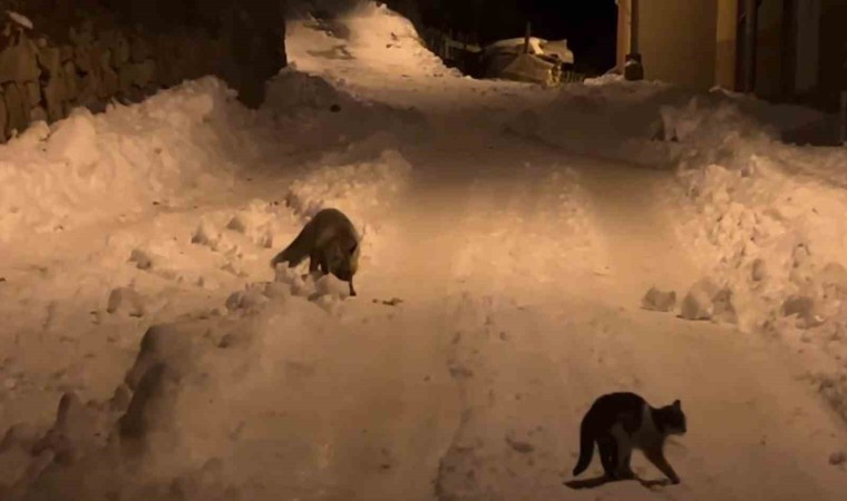 Gümüşhane’nin Torul ilçesine bağlı Cebeli Köyü’nde de yiyecek aramak için köye inen bir tilki ile kedinin karşılaşması yine bir vatandaş tarafından görüntülendi.