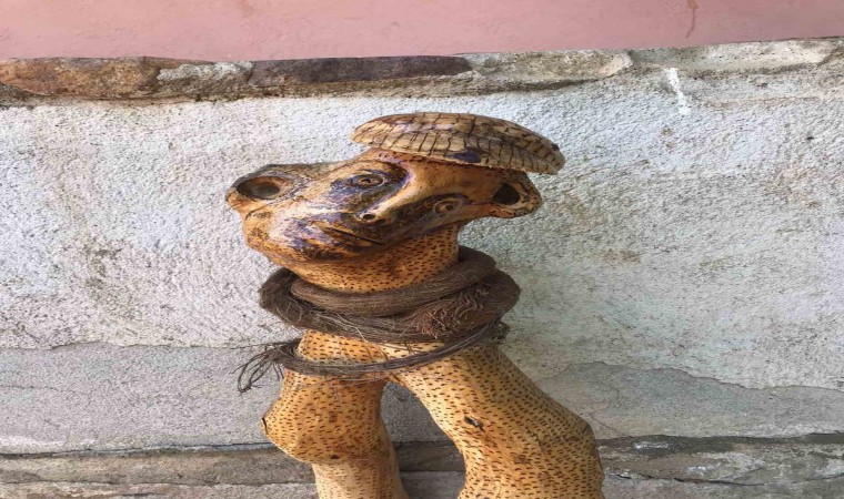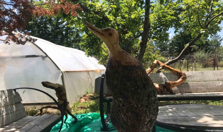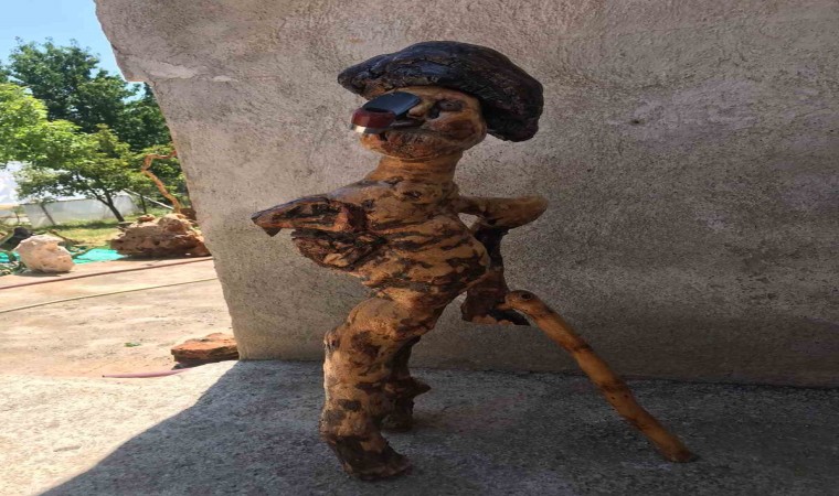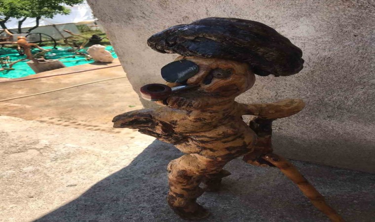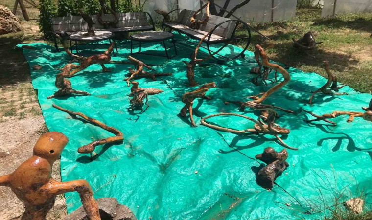 Yeniköy köyünde bulunan evinin alt katında bulunan küçük atölyesinde zımpara, cila ve törpü yardımıyla ağaç köklerini sanat eserine dönüştüren Kara’nın binden fazla eseri bulunuyor.