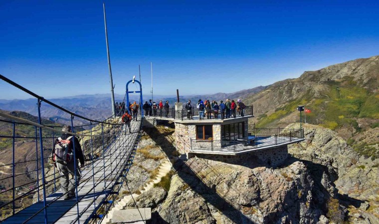 Bu haftaki yürüyüş parkuru Söğütağıl köyünün 2 bin 160 metre rakımlı Madenin Sırtı mevkiinde İsmet Şişman’ın 35 metre yüksekliğindeki kayayı asma köprüyle birleştirerek yaptığı seyir terası, asma köprü ve dağ evinden başladı.