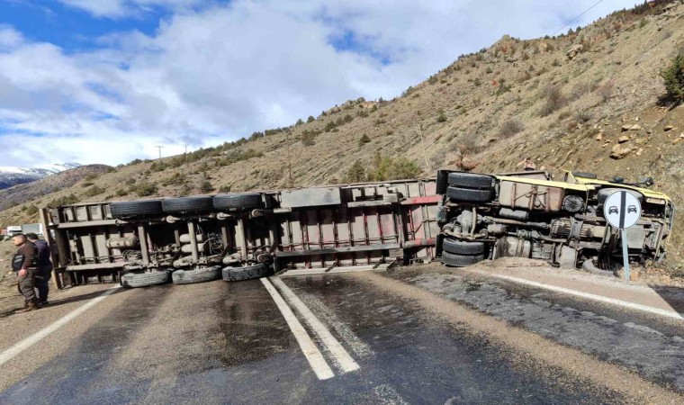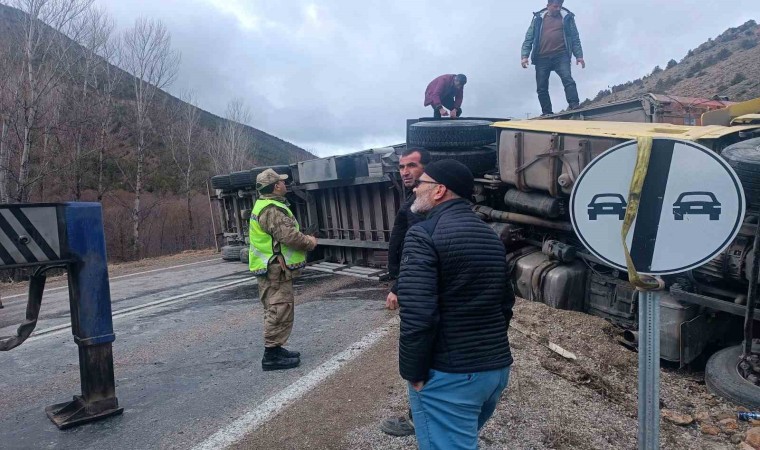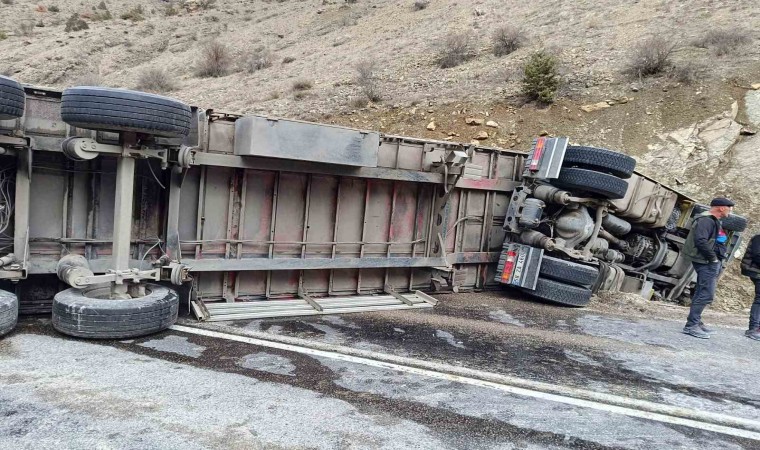 Karayolları ve Jandarma ekipleri tırın yoldan kaldırılarak ulaşımın tamamen açılması için çalışmalarını sürdürüyor.