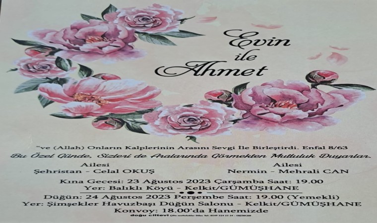 Otomobil sürücüsü Ahmet Enes Can ile Evin Can’ın 3 Ağustos tarihinde Kelkit’te resmi nikah kıydıkları ve Çarşamba günü gerçekleşecek kına gecesi için Kelkit’e geldikleri öğrenildi.