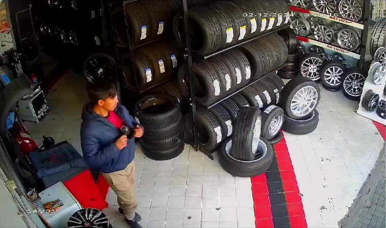 İş yerinin içerisine giren şüpheli soğukkanlı bir şekilde hava bijon sökme tabancasını tezgahtan alıp montunun cebine koydu. Bu anlar ise anbean güvenlik kamerasına yansıdı.
