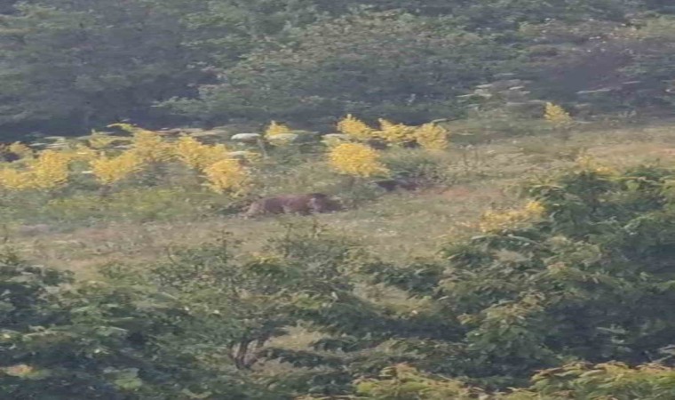 Önce anne ayının 2 yavrusuyla otlamalarını izleyip cep telefonuyla kayıt altına alan vatandaşlar daha sonra torpil atarak ayıların korkup kaçmasını sağladı.