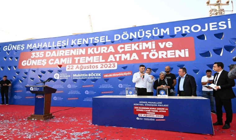 Antalya Büyükşehir Belediyesi’nin planlı, kurallı ve kimlikli bir kent inşa edilebilmesi için Güneş Mahallesi’nde başlattığı kentsel dönüşüm projesinde sona gelindi. Antalya Büyükşehir Belediyesi iştiraki ANTEPE kontrolünde inşaatı tamamlanan Güneş Mahallesi Kentsel Dönüşüm Projesi’nde hak sahiplerine ait 335 dairenin bağımsız bölüm numaralarını belirlemek üzere Antalya 16. Noterliği huzurunda kura çekimi gerçekleştirildi.