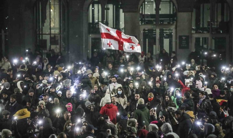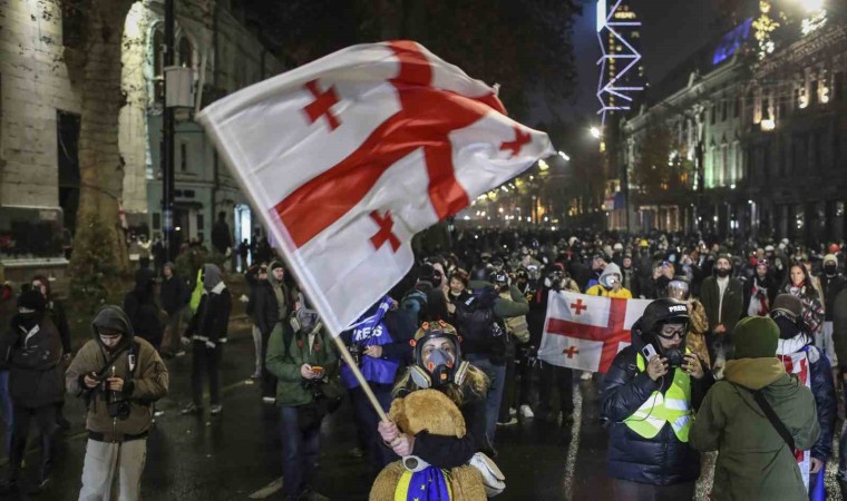 Gürcistan’da Başbakan İrakli Kobakhidze hükümetinin AB’ye katılım müzakerelerini 2028’e kadar durdurma kararına tepki olarak düzenlenen protestolar 9. günde devam etti. Başkent Tiflis’in Şota Rustaveli Caddesi’ndeki parlamento önünde yerel saatle 20.00’de başlayan protestoda göstericilerin havai fişek ve yabancı maddeler fırlatmasıyla bir kez daha tansiyon yükseldi. Polis, tazyikli su, biber gazı ve göz yaşartıcı gazla protestoculara müdahale etti. Parlamento binası önünden en az 150 metre uzaklaştırılan protestocular, Cumhuriyet Meydanı’na geçti. Kısa süre sonra tekrar Şota Rustaveli Caddesi’ne dönen protestocular, taş, cam şişe ve havai fişeklerle polise saldırdı. Polisin müdahalesine rağmen protesto gece saatlerine kadar devam etti.