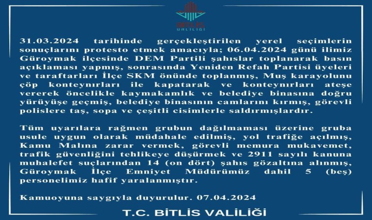 Olayla ilgili Bitlis Valiliğinin yaptığı açıklamada, “31.03.2024 tarihinde gerçekleştirilen yerel seçimlerin sonuçlarını protesto etmek amacıyla; 06.04.2024 günü ilimiz Güroymak ilçesinde DEM Partili şahıslar toplanarak basın açıklaması yapmış, sonrasına Yeniden Refah Partisi üyeleri ve taraftarları İlçe SKM önünde toplanmış, Muş karayolunu çöp konteynırları ile kapatarak ve konteynırları ateşe vererek öncelikle kaymakamlık ve belediye binasına doğru yürüyüşe geçmiş, belediye binasının camlarını kırmış, görevli polislere taş, sopa ve çeşitli cisimlerle saldırmışlardır. Tüm uyarılara rağmen grubun dağılmaması üzerine gruba usule uygun olarak müdahale edilmiş, yol trafiğe açılmış, Kamu Malına zarar vermek, görevli memura mukavemet, trafik güvenliğini tehlikeye düşürmek ve 2911 sayılı kanuna muhalefet suçlarından 14 (on dört) şahıs gözaltına alınmış, Güroymak İlçe Emniyet Müdürümüz dahil 5 beş personelimiz hafif yaralanmıştır” denildi.