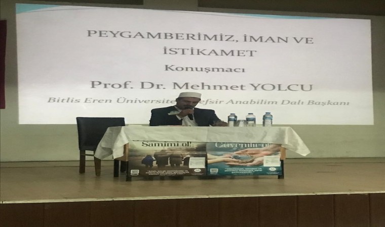 Güroymak Yatılı Bölge Okulu konferans salonunda düzenlenen etkinlik Kur’an-ı Kerim tilavetiyle başladı. Güroymak Müftüsü Murat Demir’in konuşmasının ardından Bitlis Eren Üniversitesi Tefsir Anabilim Dalı Başkanı Prof. Dr. Mehmet Yolcu ise ‘Peygamberimiz, İman ve İstikamet’ konulu konferans verdi.