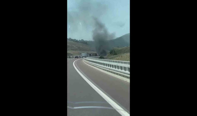 Bursa-İstanbul otobanında alev alev yanan hafif ticari araç paniğe sebep oldu. O anlar diğer sürücülerin kameralarına yansıdı.