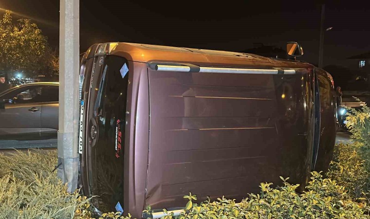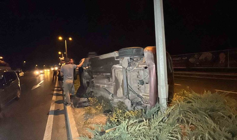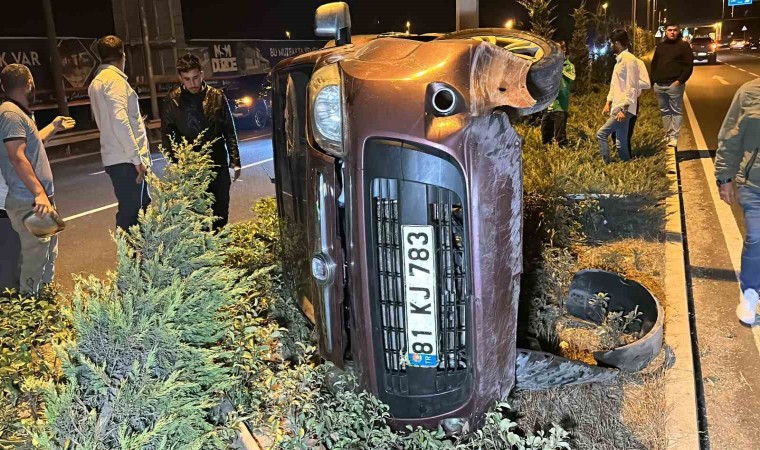 Düzce’de hafif ticari araç refüje çıkarak devrildi. Kazada şans eseri kimse yaralanmazken yolda uzun araç kuyruğu oluştu.