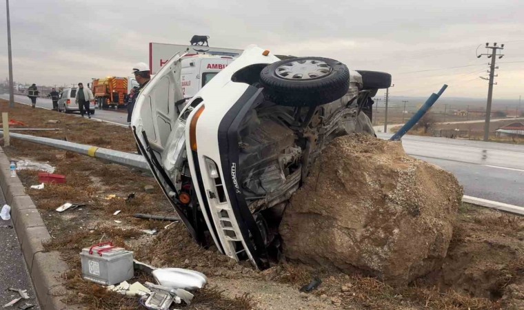 Aksaray’da hafif ticari araca çarpan otomobil takla atarak refüjdeki aydınlatma direğine çarptı. Kazada otomobil sürücüsü ağır yaralandı.