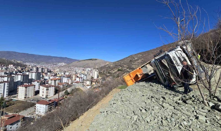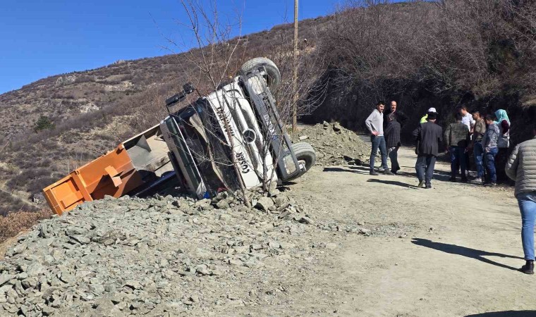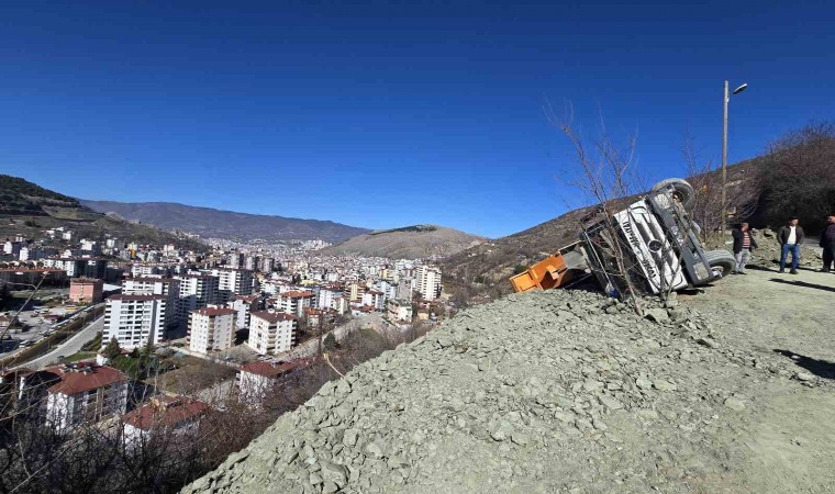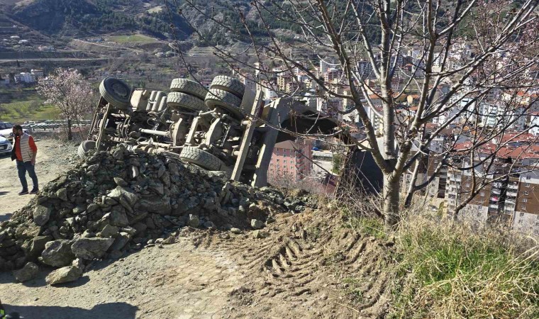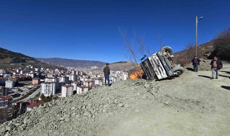 Tokat’ın Kemer Mahallesi’nde yol inşaatı sırasında hafriyat döken bir kamyon yan yattı.