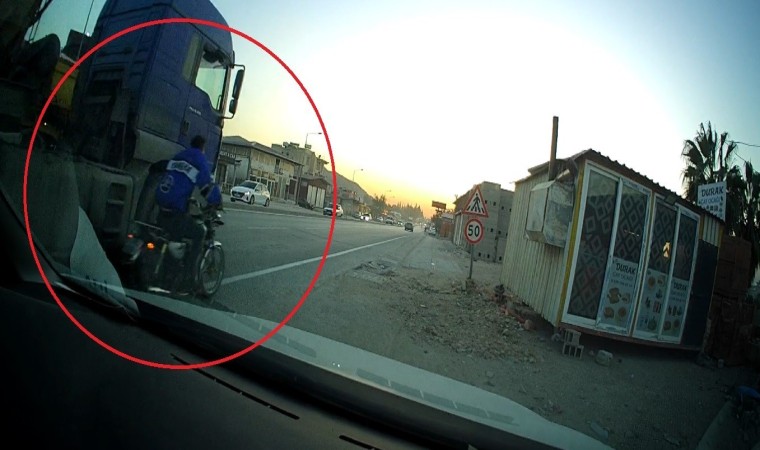 Olay, Antakya ilçesi Narlıca Mahallesi mevkiinde yaşandı. Trafikte ilerleyen motosiklet sürücüsü, hafriyat kamyonunu sağ tarafından sollayarak tehlikeye neden oldu. Sürücü, bir süre ilerledikten sonra ön kaldırdı. Motosikletlinin canını hiçe saydığı o anlar araç kamerasına yansıdı.