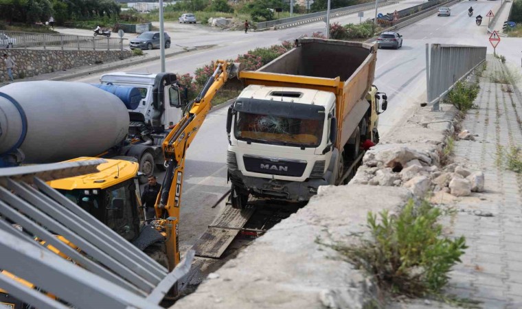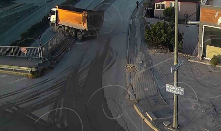 Hatay’da yola dökülen sıvının etkisiyle sürücüsünün direksiyon hakimiyetini kaybettiği hafriyat kamyonunun 5 metrelik duvardan uçtuğu anlar kameraya yansıdı.