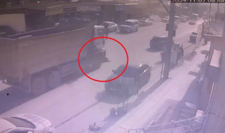 Hatay’da hafriyat kamyonuyla çarpışan motosikletli kazadan hafif yaralı olarak kurtuldu. Kaza anı kameraya yansıdı.