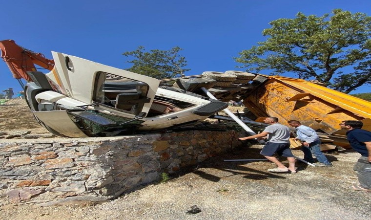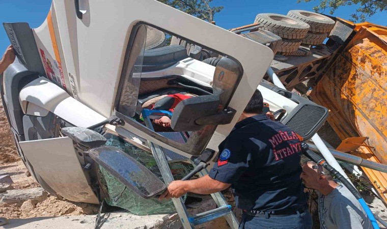 Muğla’nın Menteşe ilçesinde hafriyat yüklü kamyon, yük boşalttığı esnada bir anda kayarak yan yattı. Kamyon içerisinde sıkışan sürücü, itfaiye ekipleri tarafından kurtarıldı.