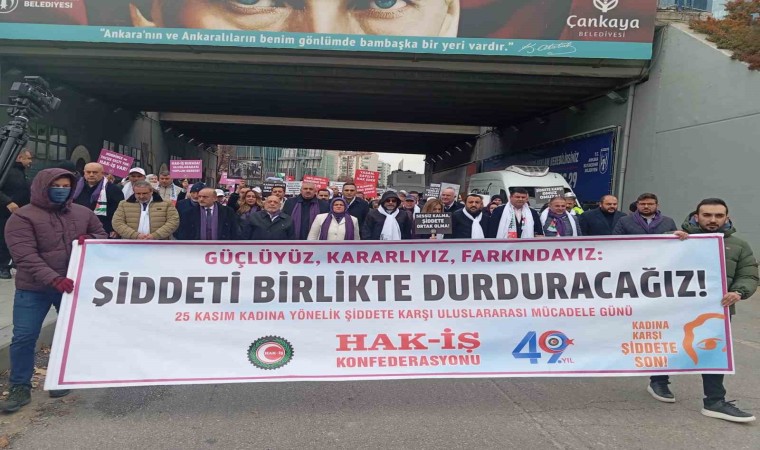 HAK-İŞ Konfederasyonu, ‘25 Kasım Kadına Yönelik Şiddete Karşı Uluslararası Mücadele Günü’ kapsamında Filistinli kadınlar başta olmak üzere kadınlara yapılan şiddeti kınamak için 81 ilde eş zamanlı eylem gerçekleştirdi. Ankara’da gerçekleştirilen eylemde, HAK-İŞ Genel Başkanı Mahmut Arslan ve Konfederasyon üyeleri tarafından ABD Büyükelçiliği’ne ‘Kadına şiddete hayır’ sloganlarıyla yürüyüş yapıldı. Yürüyüşün ardından basın açıklaması yapan HAK-İŞ Genel Başkanı Mahmut Arslan, hem Filistin’de kadınların yaşadığı şiddeti göz önüne sermek hem de Türkiye’de kadına yönelik şiddetle mücadelede yeni bir alan açmak için harekete geçtiklerini dile getirdi.