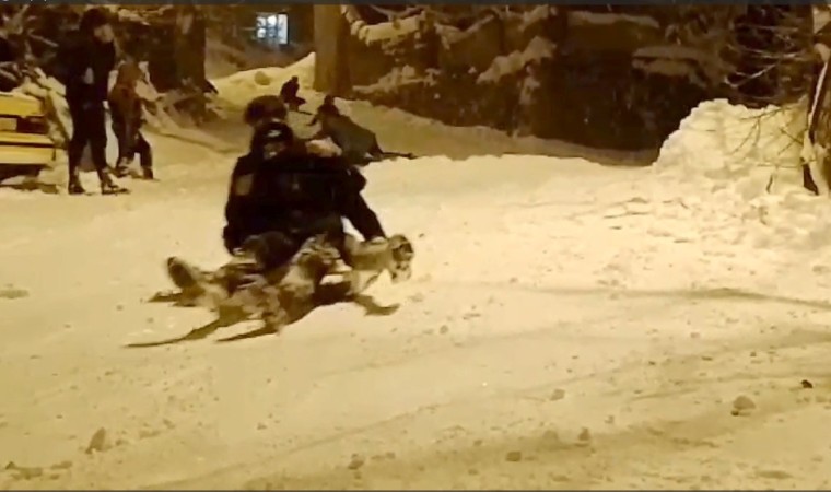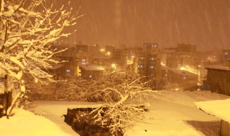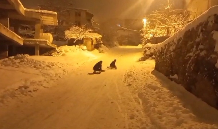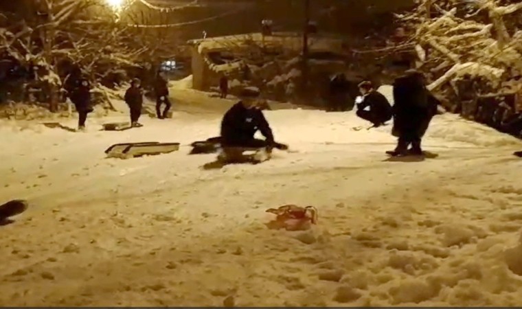 Hakkari’de akşam saatlerinde şiddetini arttıran kar yağışı sonrasında kızaklarını alan çocuklar, karanlıkta kaymanın keyfini yaşadı.