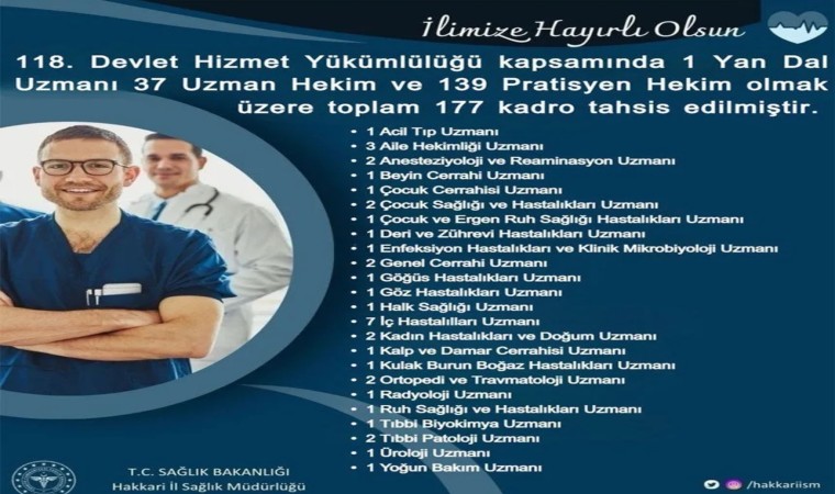 Sağlık Bakanlığının 118. Dönem Devlet Hizmeti Yükümlülüğü Kurası kapsamında, Hakkari’ye 1 yan dal uzmanı, 37 uzman hekim ve 139 pratisyen hekim olmak üzere toplam 177 kadro tahsis edildi. Hakkari Valiliğinin sosyal medya hesabından yapılan açıklamada, "118. Devlet Hizmet Yükümlülüğü Kapsamında ilimize 1 yan dal uzmanı, 37 uzman hekim ve 139 pratisyen hekim olmak üzere toplam 177 kadro tahsis edildi. Yapılan kadro tahsislerinin Hakkari ilimize hayırlar getirmesini temenni ederek, Cumhurbaşkanımız Recep Tayyip Erdoğan ve Sağlık Bakanımız Prof. Dr. Kemal Memişoğlu’na şükranlarımızı arz ederiz" denildi.