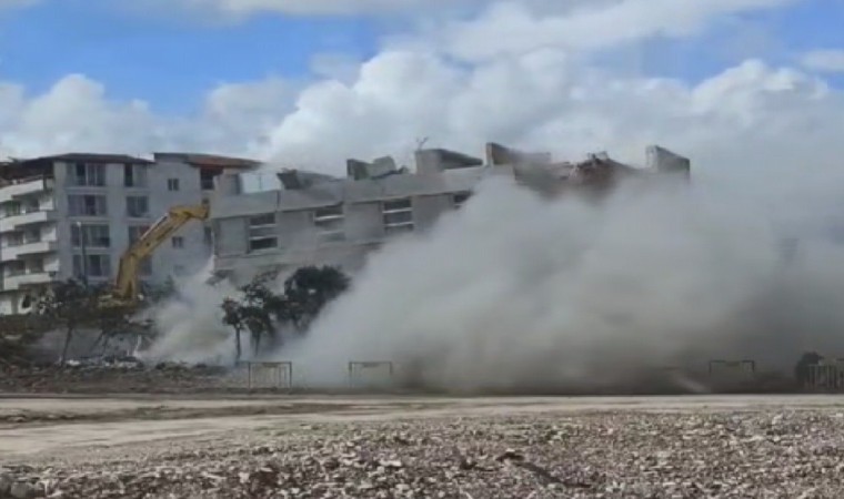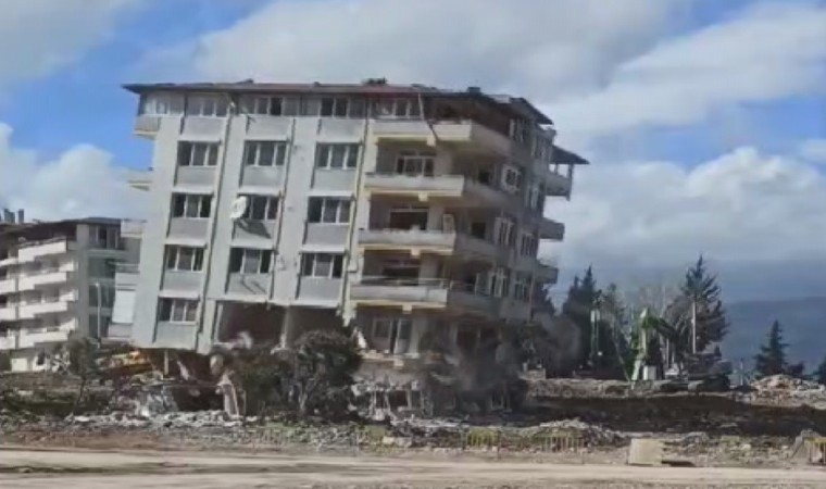 Kahramanmaraş merkezli depremlerde büyük yıkımın yaşandığı Hatay’da enkaz kaldırma çalışmalarında sona gelindi. Depremin vurduğu Antakya ilçesi Esentepe Mahallesi’nde mahkeme süreci tamamlanan 6 katlı bina, iş makinesiyle halatla çekilerek kontrollü olarak yıkıldı. Binanın halatla çekilerek kontrollü olarak yıkıldığı anlar cep telefonu kamerasıyla saniye saniye görüntülendi. Görüntülerde, 6 katlı binanın domino taşı gibi devrildiği anlar yer aldı. 6 katlı binanın kontrollü yıkımı sırasında ise herhangi bir olumsuzluk yaşanmadı.