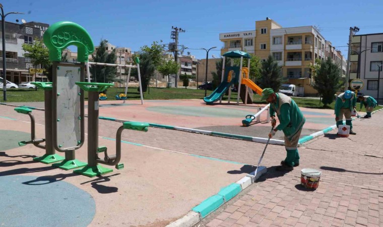 Haliliye Belediyesi Çevre Koruma ve Kontrol Müdürlüğü, çocukların güven içerisinde zaman geçirmesi için mevcut parklardaki oyun gruplarını bakım ve onarım çalışmalarıyla yenilerken, bordür boyama çalışmasıyla parklara estetik görüntü kazandırılıyor.