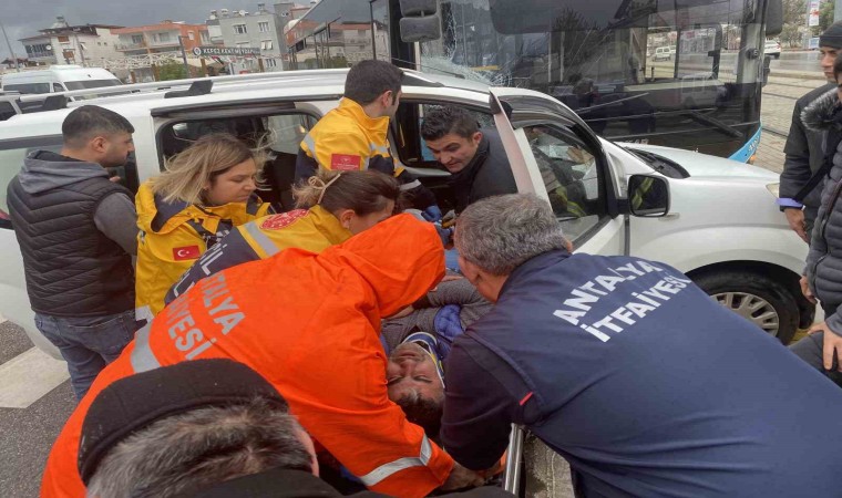 Kaza, dün saat 13.22’de Kepez ilçesi Gündoğdu Mahallesi Yeşilırmak Caddesi’nde meydana geldi. Edinilen bilgiye göre, 07 AU 0402 plakalı Abdülkadir Koşu (58) idaresindeki halk otobüsü ile İsmail Kondu (39) idaresindeki 06 CLP 049 plakalı hafif ticari araç, Seyhan Caddesi ile Yeşilırmak Caddesi kesişiminde çarpıştı. İhbar üzerine kaza yerine sağlık, itfaiye ve polis ekipleri sevk edildi. İtfaiye ekibinin yaptığı kontrolde, hafif ticari aracın sürücüsü İsmail Kondu’nun araçta sıkıştığı belirlendi. İtfaiye ekiplerinin kısa sürede müdahalesi ile şoför sıkıştığı yerden çıkartılarak sağlık ekiplerine teslim edildi. Yaralı şoför ambulans ile hastaneye kaldırılırken, otobüste ise yaralanan olmadı. Polis ekipleri yolu kısmen trafiğe kapatırken, kazayla ilgili çalışma başlatıldı.