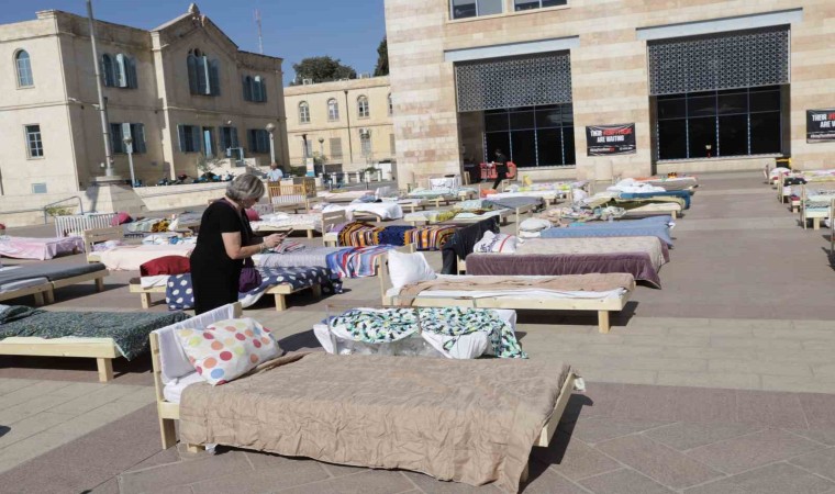 Protestoda sergilenen yatakların Gazze Şeridi’nde yerinden edilmiş sakinler için bir eve bağışlanacağı ifade edildi.