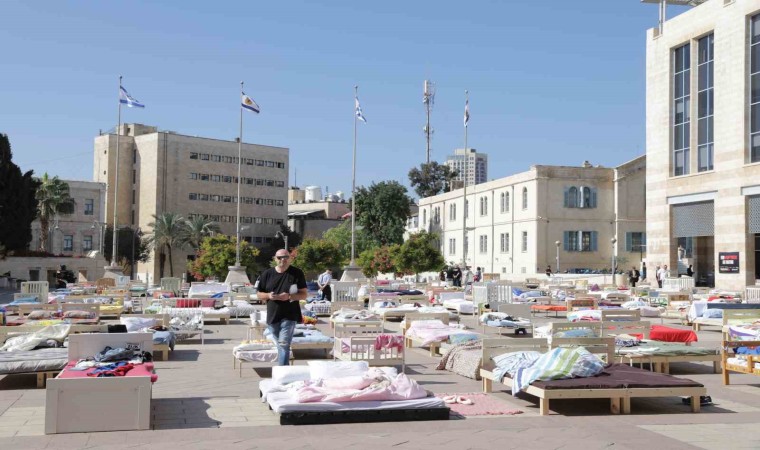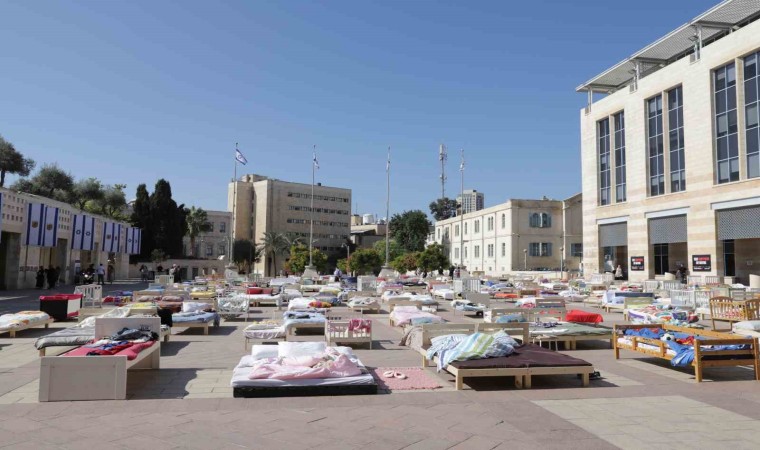 İsrailliler, Batı Kudüs’te Hamas tarafından rehin alınanlar için Kudüs Belediye Meydanı’nda yüzlerce yatakla protesto gerçekleştirdi.
