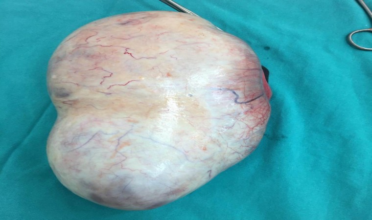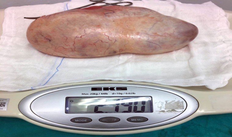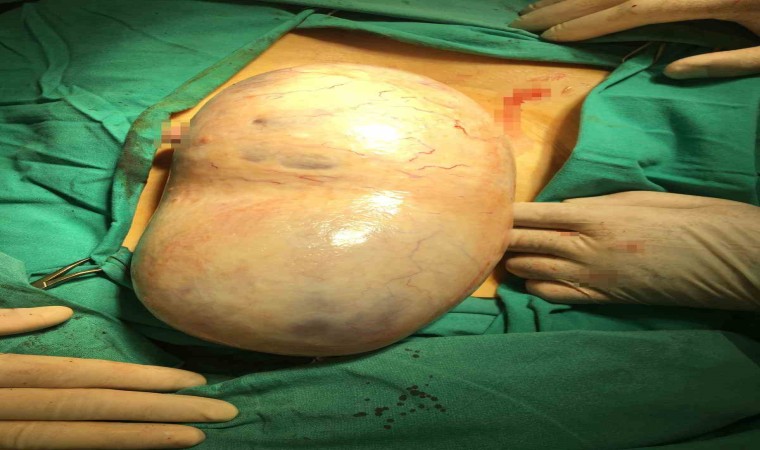 Ameliyatla karnından 2 kilo 160 gramlık iyi huylu kanser hücresi çıkartılan 31 yaşındaki hastanın genel sağlık durumunun iyi olduğu ifade edildi.