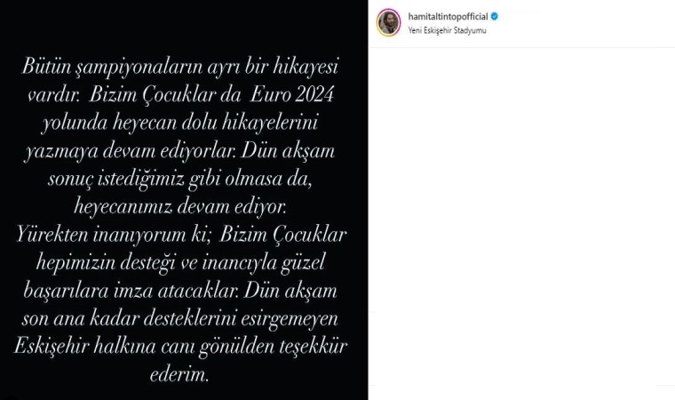 TFF Milli Takımlardan Sorumlu Yönetim Kurulu Üyesi Hamit Altıntop, Ermenistan maçıyla ilgili sosyal medya hesabından paylaşım yaptı. Bütün şampiyonaların ayrı bir hikayesi olduğunu belirten Altıntop, "Bizim Çocuklar da EURO 2024 yolunda heyecan dolu hikayelerini yazmaya devam ediyorlar. Dün akşam sonuç istediğimiz gibi olmasa da heyecanımız devam ediyor. Yürekten inanıyorum ki; Bizim Çocuklar hepimizin desteği ve inancıyla güzel başarılara imza atacaklar. Dün akşam son ana kadar desteklerini esirgemeyen Eskişehir halkına canı gönülden teşekkür ederim" ifadelerini kullandı.