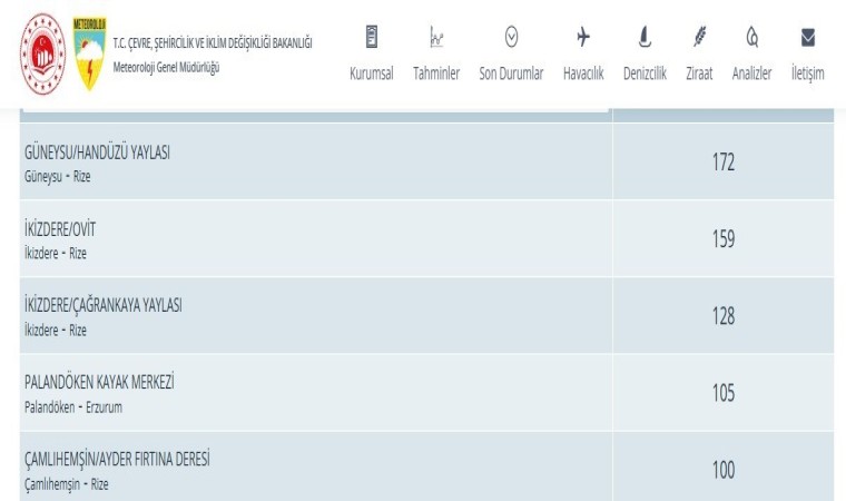 Sahil kesimlerinden şiddetli fırtınanın etkili olduğu Rize’nin yüksek kesimlerinde de kar yağışı etkili oldu. Meteoroloji Genel Müdürlüğü’nün verilerine göre Türkiye’de kar kalınlığının en fazla olduğu il Rize oldu. 172 santimetre kar kalınlığı ile Rize’nin Güneysu ilçesine bağlı Handüzü Yaylası Türkiye’deki en yüksek kar kalınlığı olan bölge olarak verilere geçerken, 159 santimetre ile yine Rize’nin İkizdere ilçesine bağlı Ovit Dağı ve 128 santimetre kar kalınlığı ile İkizdere ilçesine bağlı Çağrankaya Yaylası Türkiye’de kar kalınlığı olarak başı çekti. Erzurum’a bağlı Palandöken Kayak Merkezi ise 105 santimetrelik kar kalınlığı ile 4. sırada yer aldı. 5. sırada ise 100 santimetre ile Rize’nin Çamlıhemşin ilçesine bağlı Ayder Yaylası geldi.