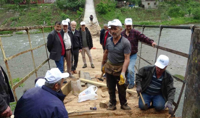 Köylülerin imece usulüyle onardığı ahşap köprü uzun yıllardır bölge halkının ulaşımını sağlasa da beton köprü talepleri yetkililere iletilmeye devam ediyor. Giresun’un Tirebolu ilçesi Ketençukuru ve Kuzgun köylerindeki vatandaşlar, hem araç hem de yaya ulaşımında kullandıkları Harşit Çayı üzerine çelik halatlara bağlı ahşap köprüyü imece usulüyle onarıyor.