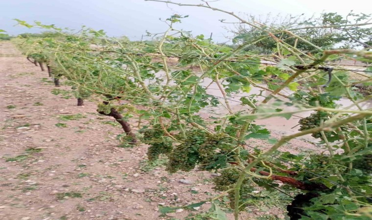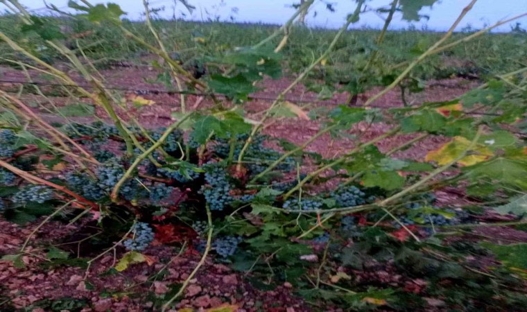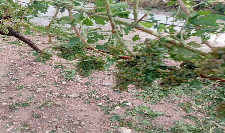 Denizli’de akşam saatlerinde etkili olan şiddetli yağış ve fırtına, yaşamı olumsuz yönde etkiledi. Güney ilçesinde de hasada hazırlanan üzüm bağlarını dolu vurdu.