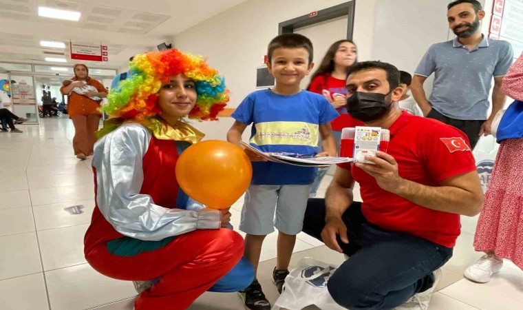Dörtyol Devlet Hastanesi Çocuk Servisinde tedavi gören çocukları giydikleri palyaço kıyafetler ile ziyaret eden gönüllü gençler, çocuklarla sohbet etti. Balon, boyama kitapları ve çeşitli hediyeler vererek moral oldular.