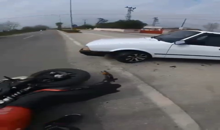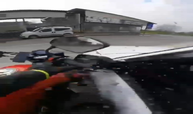 Bursa’da seyir halindeki motosiklet sürücüsü, aniden dönüş yapan sürücünün kontrolündeki otomobile çarptı. Çarpmanın etkisiyle savrulan motosikletli şans eseri kazayı ufak sıyrıklarla atlatırken, kaza anı kask kamerasına anbean yansıdı.