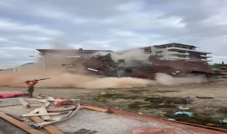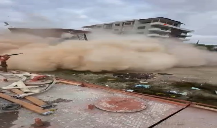 Kahramanmaraş merkezli depremlerde ağır hasar alan Hatay’da mahkeme süreci sona eren binaların yıkım ve enkaz kaldırma çalışmaları aralıksız sürüyor. Defne ilçesi Çekmece Mahallesi’nde bulunan 7 katlı bina, iş makinesi ile kontrollü olarak yıkıldı. Binanın yıkılma anı ise kameralara anbean yansıdı. 7 katlı binanın yıkımı esnasında herhangi bir olumsuzluk yaşanmadı.