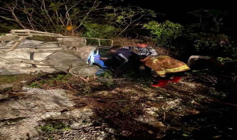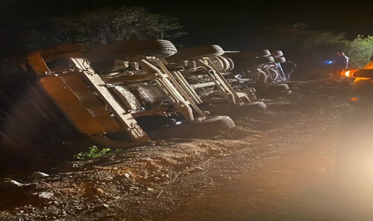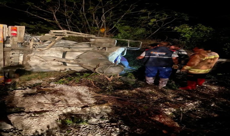 Hatay’ın Arsuz ilçesinde beton taşıyan kamyon, sürücüsünün direksiyon hakimiyetini kaybetmesiyle devrildi.