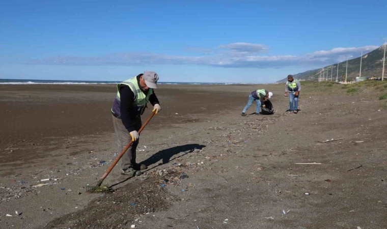 Hatay’ın Samandağ ilçesinde hafta sonu kuvvetli yağış ve fırtına nedeniyle kirlenen sahil, Hatay Büyükşehir Belediyesi tarafından temizlendi.