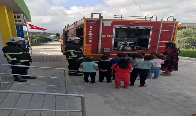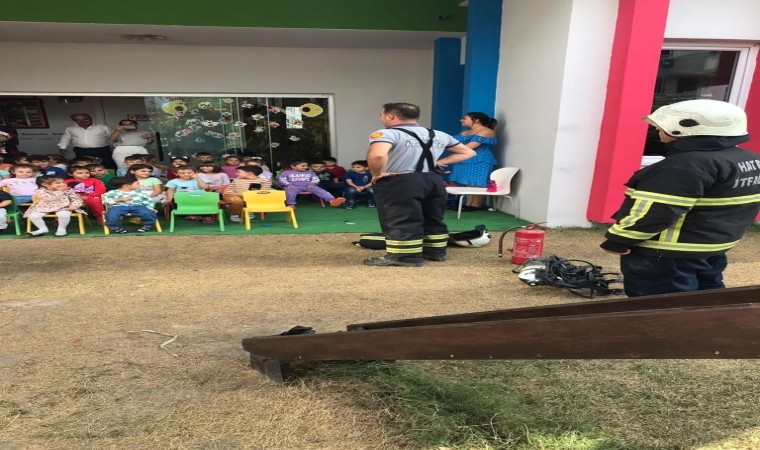 Hatay Büyükşehir Belediyesi itfaiye ekipleri, Samandağ ilçesinde bir okuldaki minik öğrencilere itfaiye eğitimi verdi.