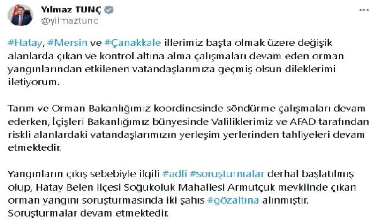 Adalet Bakanı Yılmaz Tunç, Hatay, Mersin ve Çanakkale'deki orman yangınlarının çıkış sebebiyle ilgili adli soruşturmalar başlatıldığını, Hatay'ın Belen ilçesinde çıkan yangına ilişkin ise 2 şüphelinin gözaltına alındığını duyurdu. Bakan Tunç, Twitter hesabından yaptığı paylaşımda şöyle dedi: