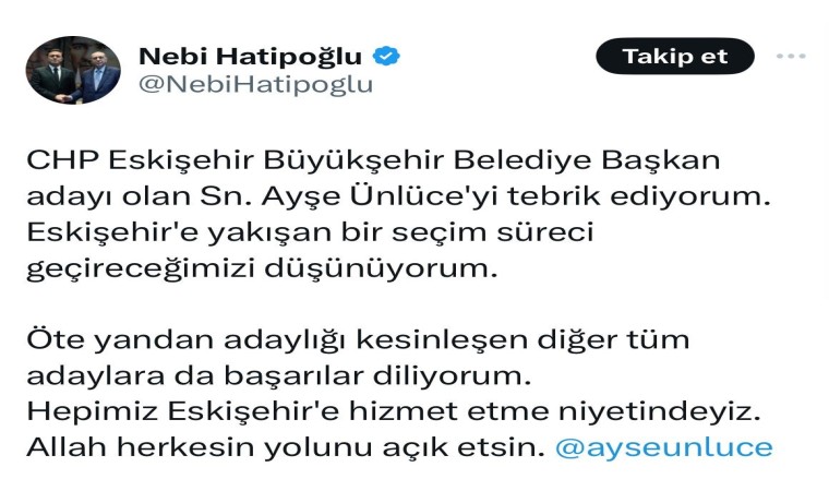 CHP tarafından Eskişehir’de Prof. Dr. Yılmaz Büyükerşen’in yerine aday gösterilen Ayşe Ünlüce’yi sosyal medya hesaplarından ilk tebrik eden, AK Parti Büyükşehir Belediye Başkan Adayı Nebi Hatipoğlu oldu. Hatipoğlu sosyal medya hesabından yaptığı açıklamada, “CHP Eskişehir Büyükşehir Belediye Başkan adayı olan Sn. Ayşe Ünlüce’yi tebrik ediyorum. Eskişehir’e yakışan bir seçim süreci geçireceğimizi düşünüyorum. Öte yandan adaylığı kesinleşen diğer tüm adaylara da başarılar diliyorum. Hepimiz Eskişehir’e hizmet etme niyetindeyiz. Allah herkesin yolunu açık etsin” ifadelerini kullandı.