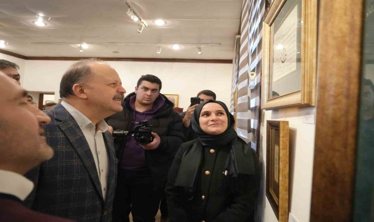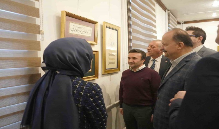 Vali Dallı ve Başkan Vekili Yurt, sergiyi gezerek hat sanatçısı Ahmet Kutluhan’dan eserler hakkında bilgiler aldı.