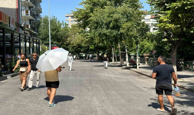 Eskişehir’de yüksek hava sıcaklığı vatandaşlara zor anlar yaşatmaya devam ediyor. Geçtiğimiz günlerde 40 derecenin üzerine çıkan sıcaklık, yaklaşık 10 derece düşerek 30 derecelere kadar indi. Sıcaklığın düşmesine rağmen kavurucu havada güneşin zararlı etkilerinden korunmak isteyen vatandaşlar, dışarıda vakit geçirirken şemsiye kullandı. Bu yıl böyle manzaralarla sık sık karşılaşan Eskişehirliler, ‘artık bu görüntüye alıştık, çok mantıklı hareket’ dedi.