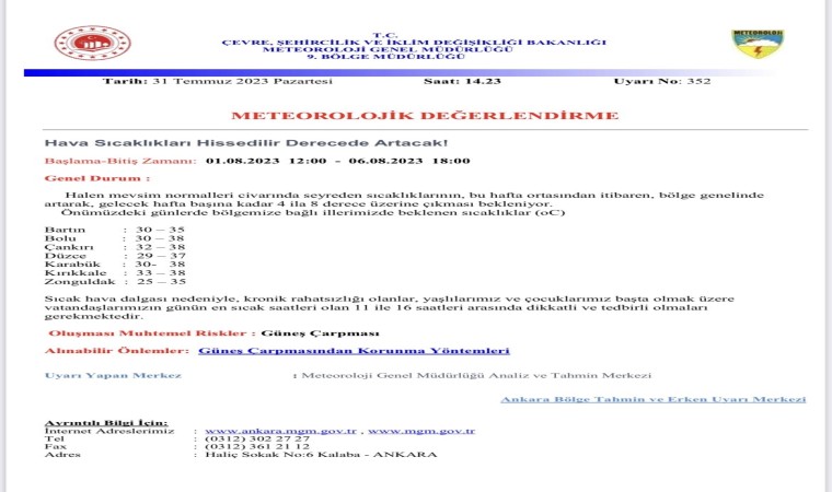 Zonguldak 25-35, Bartın 30-35, Bolu 30-38, Düzce 27-37, Karabük 30-38.Sıcak hava dalgası nedeniyle kronik rahatsızlığı olanlar, yaşlılarımız ve çocuklarımız başta olmak üzere vatandaşlarımızın günün en sıcak saatleri olan 11-16 saatleri arasında dikkatli ve tedbirli olmaları gerekmektedir.”