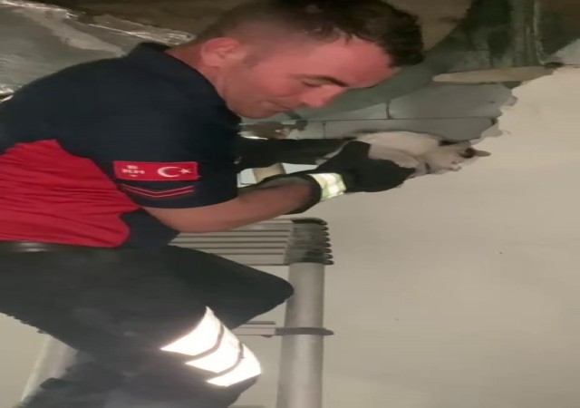 HAVALANDIRMA BOŞLUĞUNA DÜŞEN YAVRU KEDİ, İTFAİYE EKİPLERİ TARAFINDAN DUVARIN KIRILMASIYLA KURTARILDI.