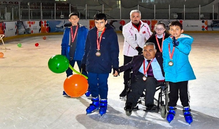 İzmir Büyükşehir Belediyesi, özel aparatlarla Bornova’daki buz pisti üzerinde kaymayı öğrenen engelli bireylere 3 Aralık Dünya Engelliler Günü’nde madalyalarını teslim etti.